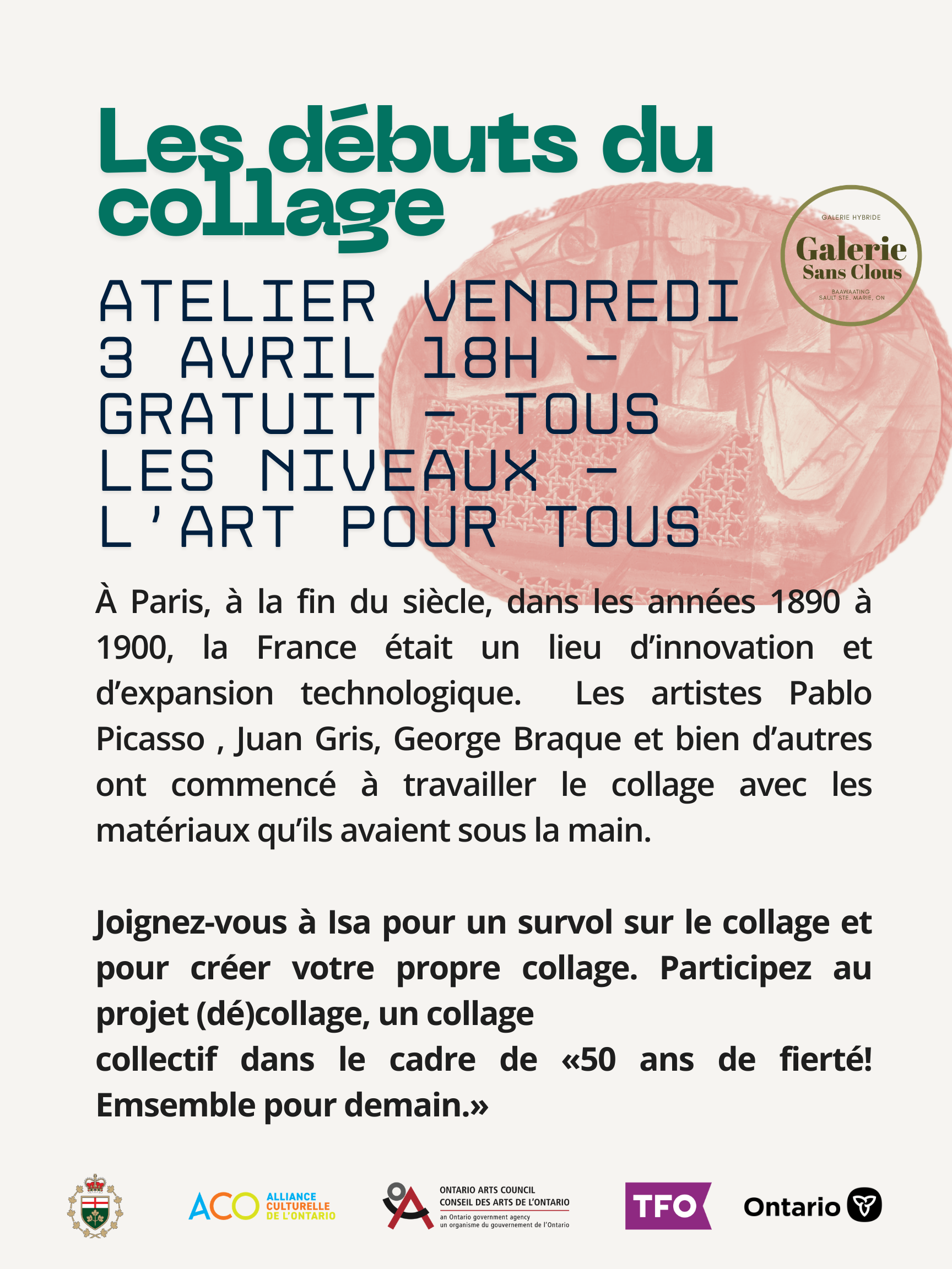 Le projet (dé)collage, un projet de collage participatif, du 3 au 30 avril 2026, à la Galerie Sans Clous, à Sault-Sainte-Marie, Baawaating.